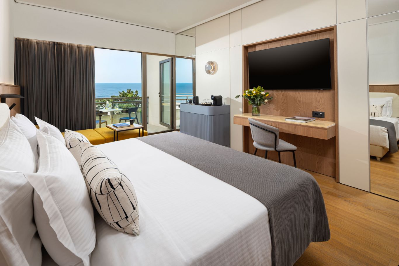 Each room features a refined bedroom with a comfortable king-sized bed, a modern bathroom with a walk-in shower, and a spacious balcony, an ideal setting to unwind while gazing at the endless blue of the sea. Perfectly suited for couples or families as the room can also accommodate a third guest on an extra bed, offering both comfort and flexibility. The interior, living space plus the balcony/exterior space of the New Executive Sea / Mouse Island View is 39 sqm (balcony spaces count around 9 sqm).